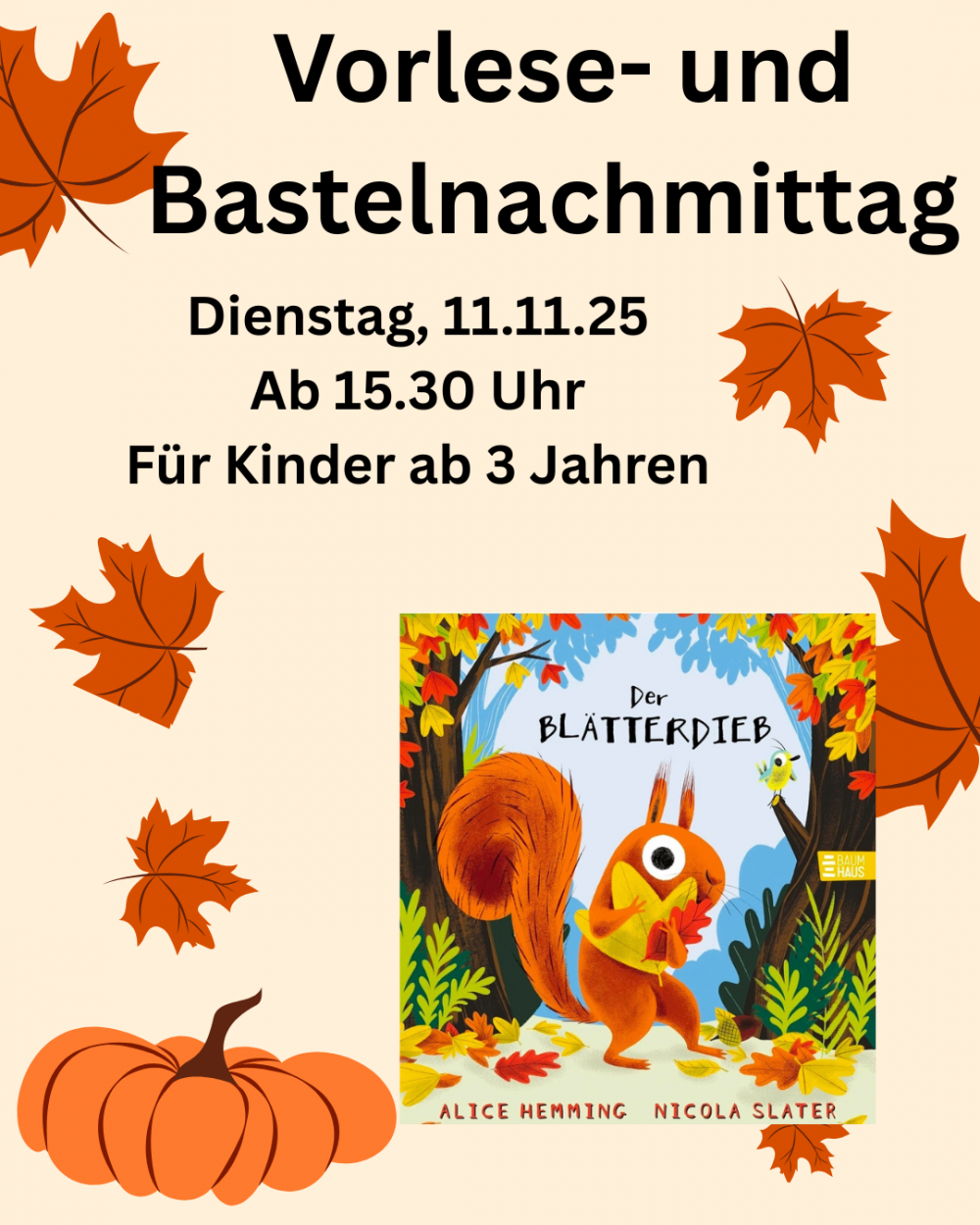 Es ist wieder soweit!Nächsten Dienstag, den 11.11.25 wird ab 15.30 aus dem Buch "Der Blätterdieb" vorgelesen und danach wird etwas ganz Tolles gebastelt.Wir freuen uns auf euch!...