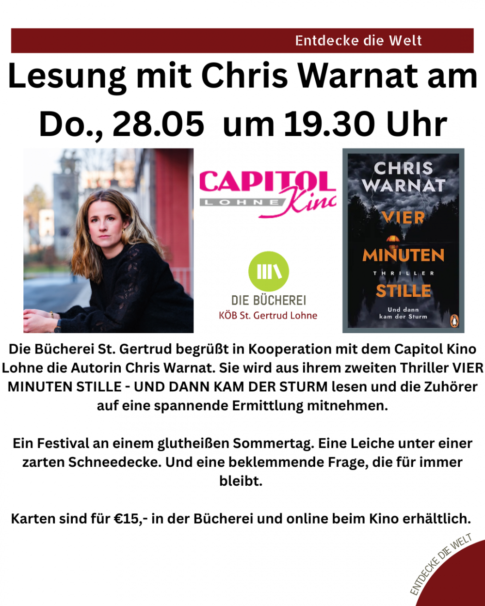 Die Bücherei St. Gertrud begrüßt in Kooperation mit dem Capitol Kino Lohne die Autorin Chris Warnat. Sie wird aus ihrem zweiten Thriller VIER MINUTEN STILLE - UND DANN KAM DER STURM le...